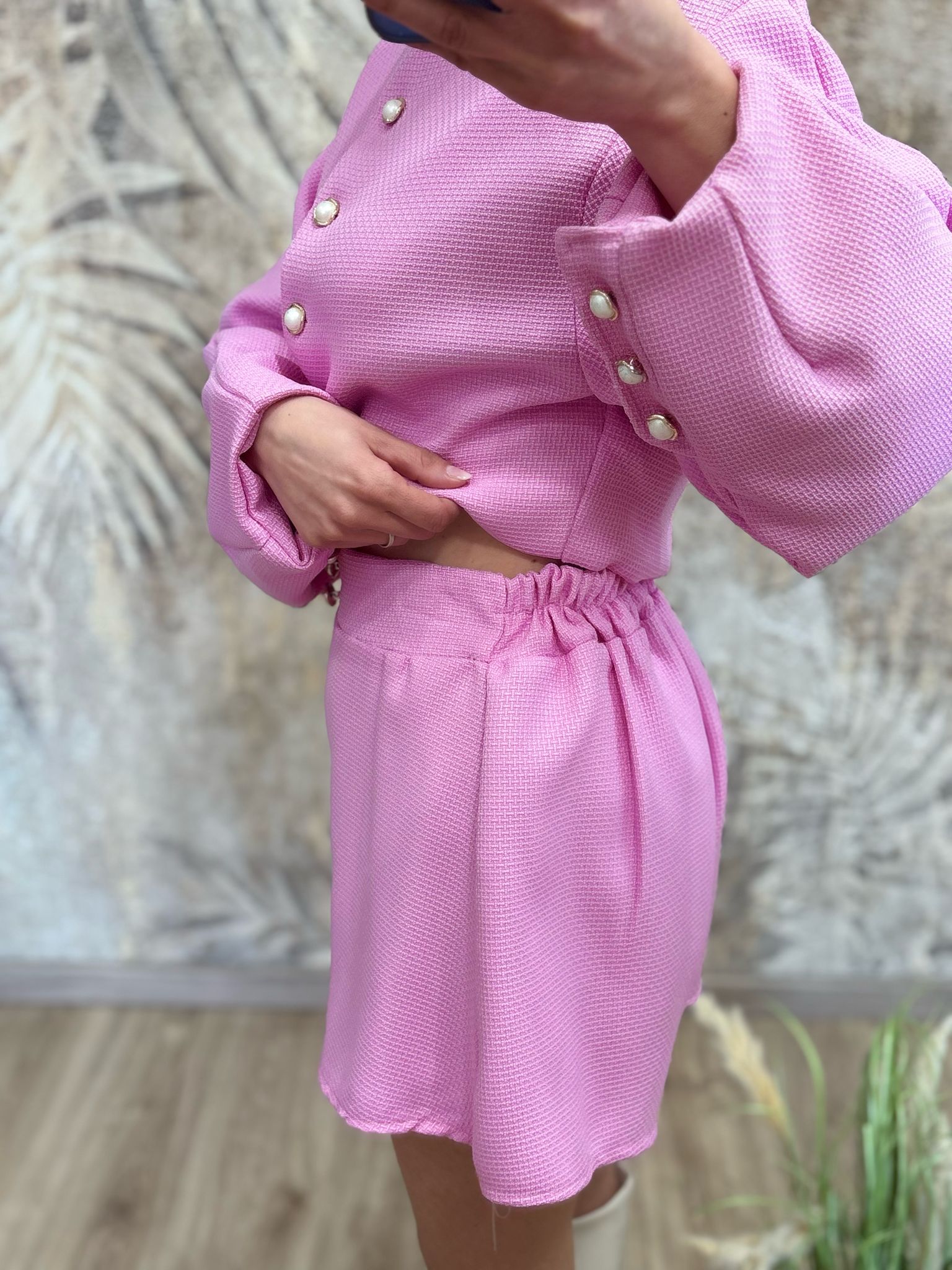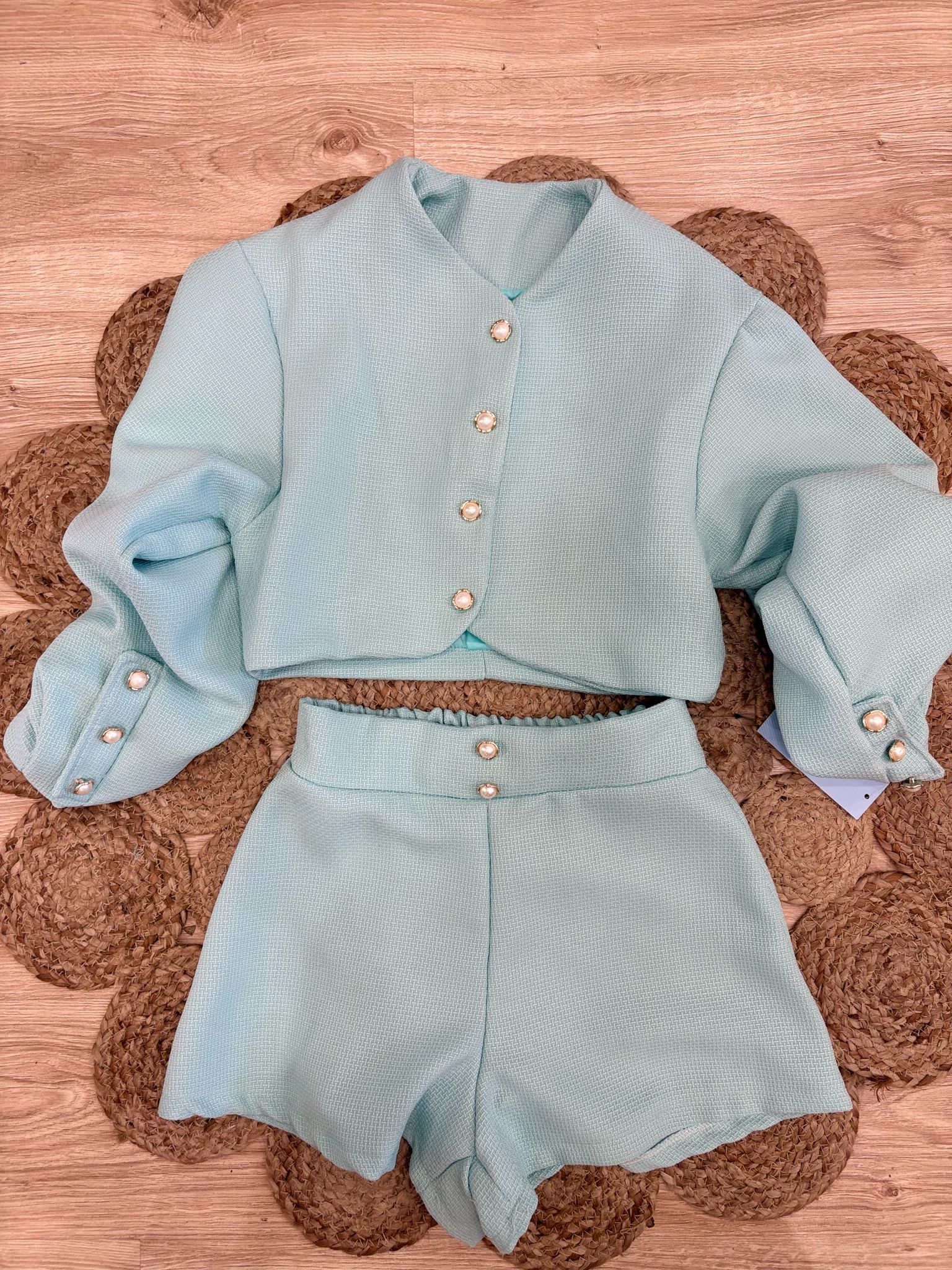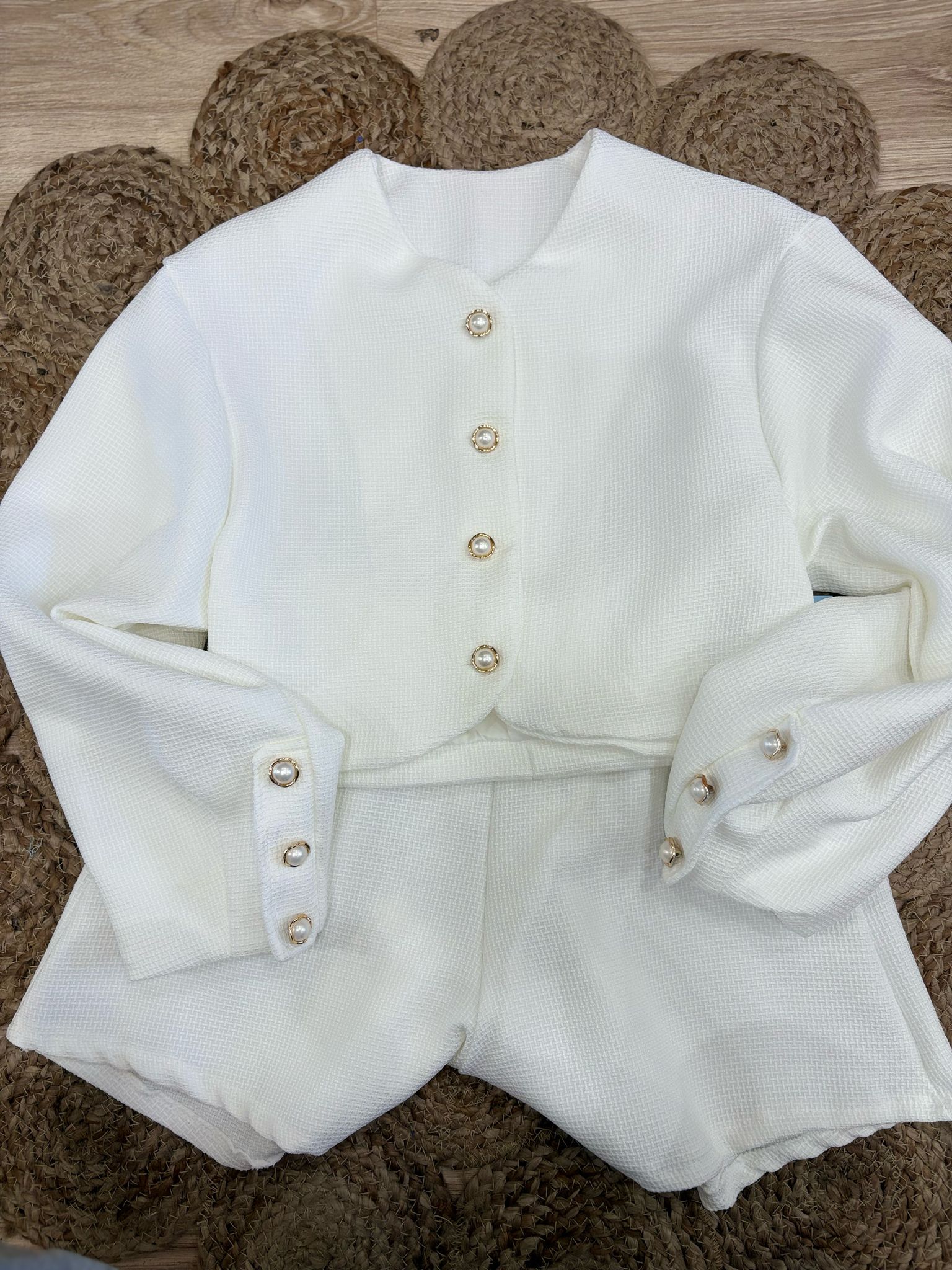 coordinato due pezzi con elastico nel retro dettaglio bottoni oro e perla