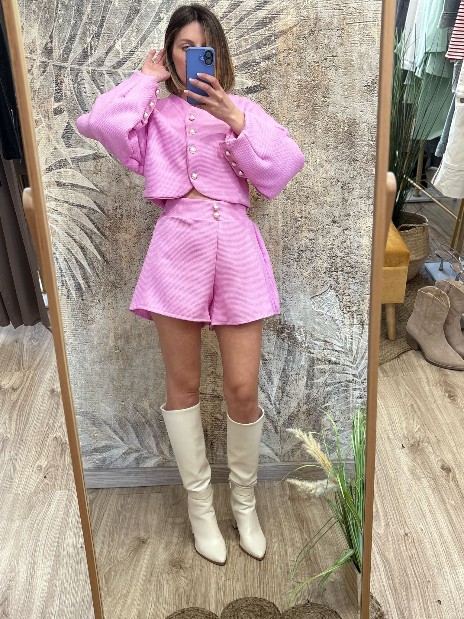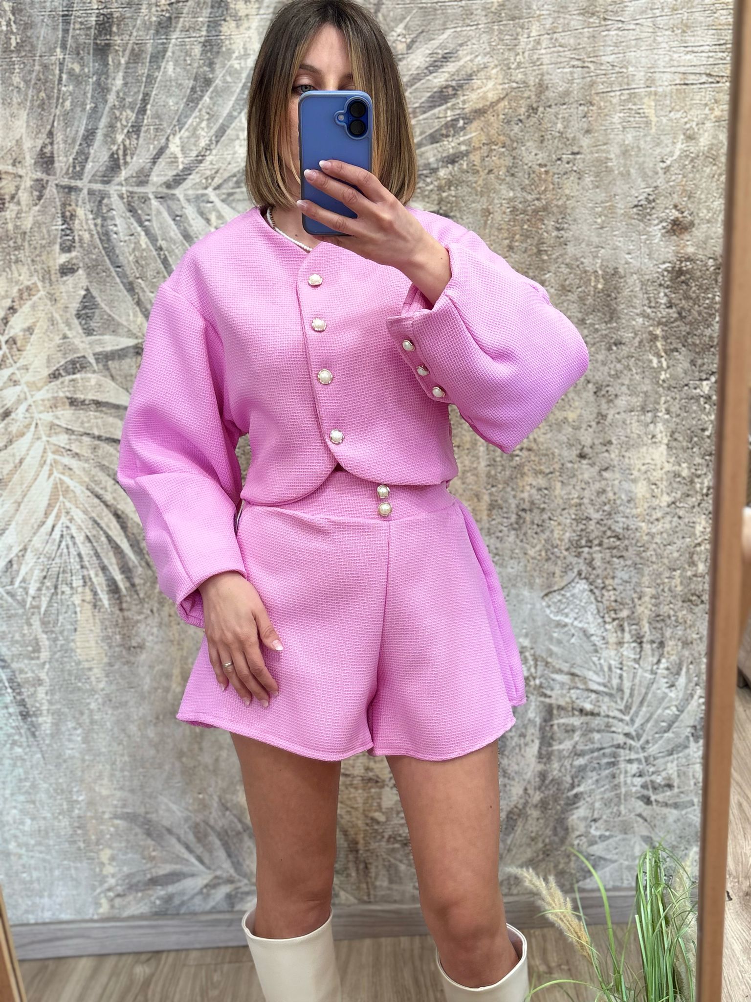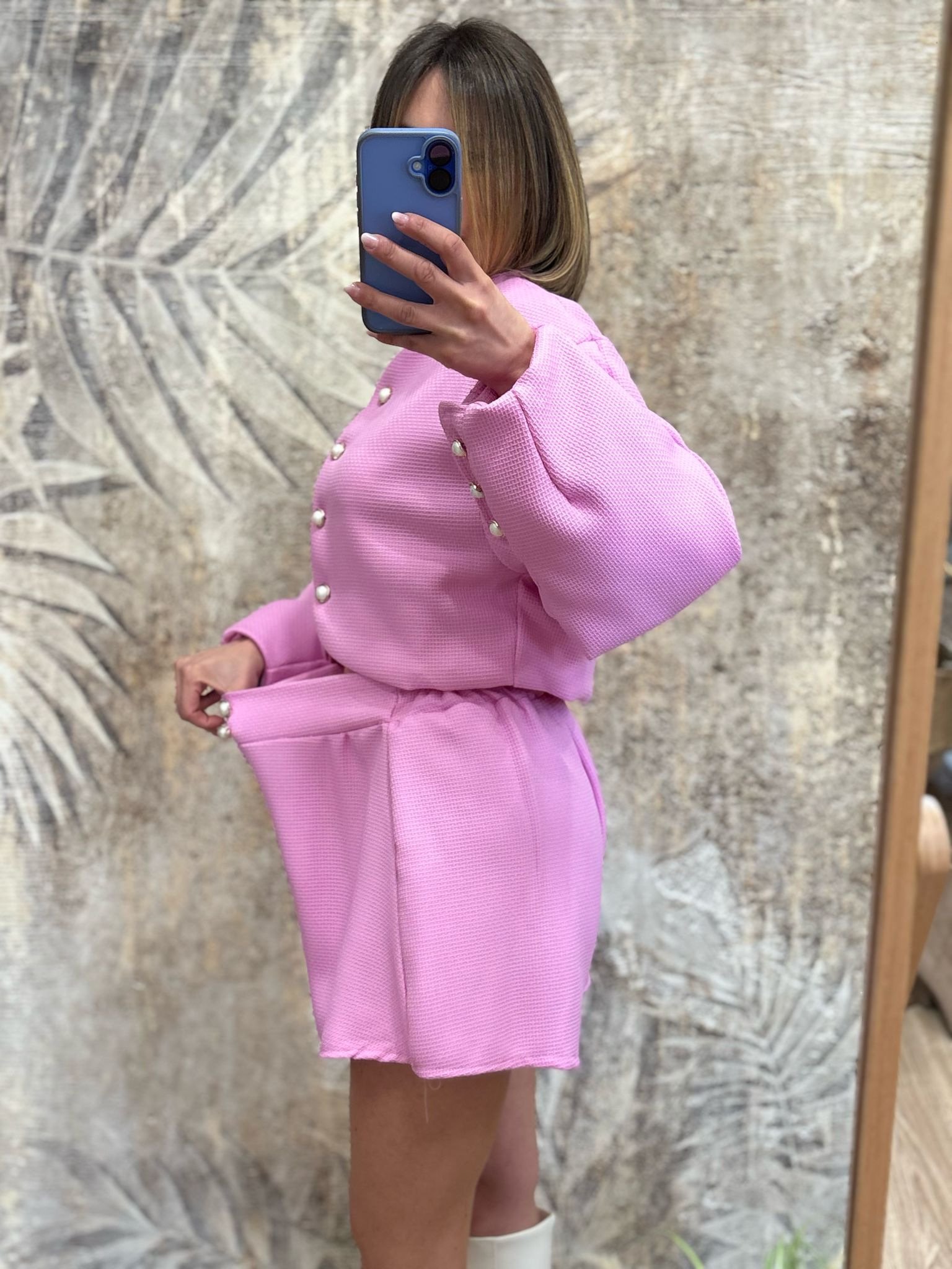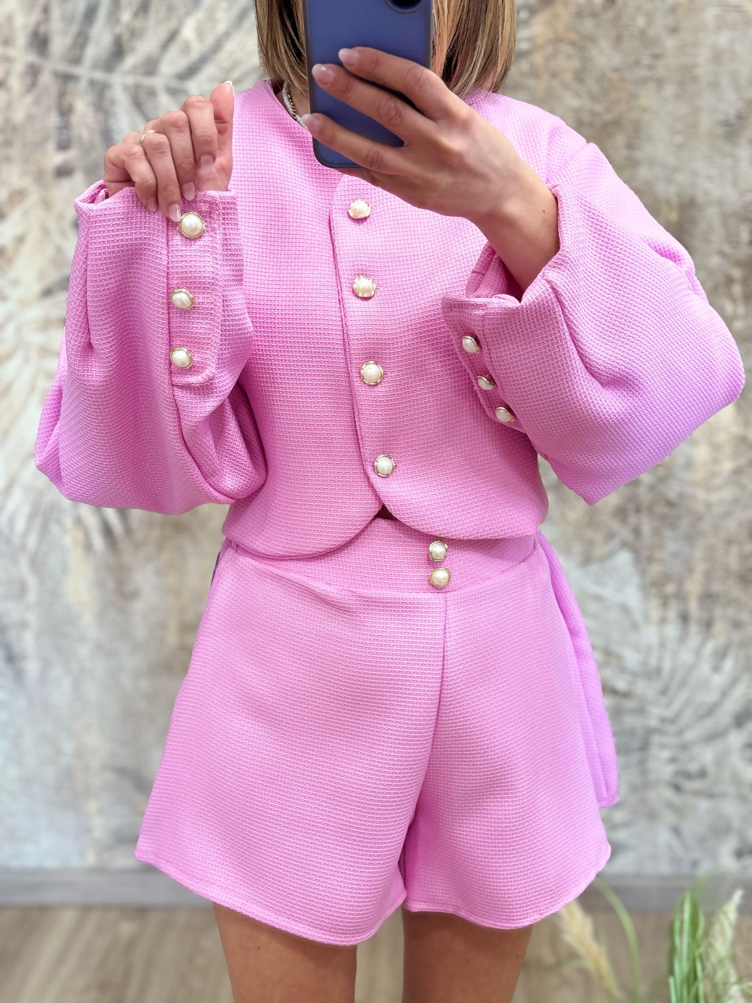 coordinato due pezzi con elastico nel retro dettaglio bottoni oro e perla